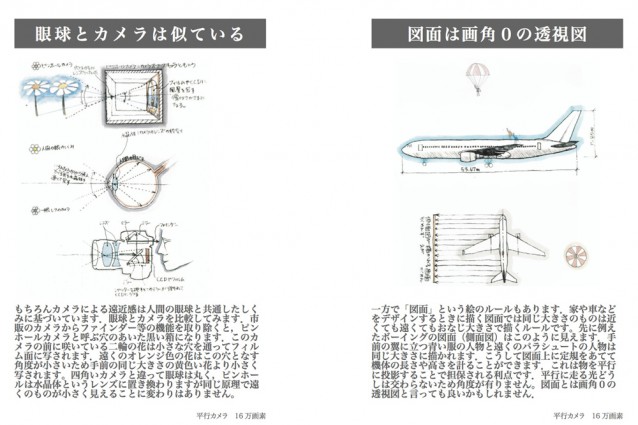 I got interested in developing a camera which can photograph an object's elevation. "Parallel camera" allows us to measure the height and width like you do on an elevation. For demonstrating parallel projection, it uses very thin camera like straw with very narrow angle, almost 0 degrees. I arrange them parallel to each other. Thus the box of parallel camera translates an object by keeping its original size and shape no matter if they are near or far from camera.